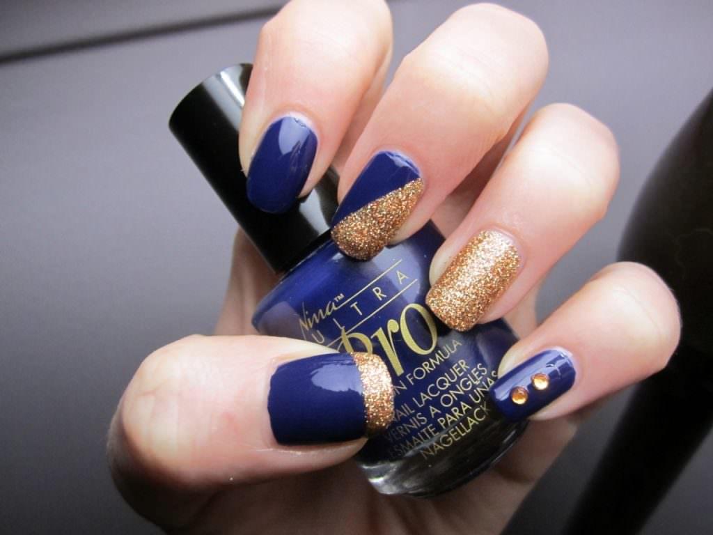 Темно-синий маникюр с легкими бликами блесток придает всему образу четкости, выразительности завершенности. Такой оттенок подойдет к любому наряду, так как может стать альтернативой черному. Декор из стразов создаст праздничное настроение. Можно сделать его минимальным, украсив камнями только один ноготь, или декорировать два средних пальца, сделав маникюр по фен-шуй.