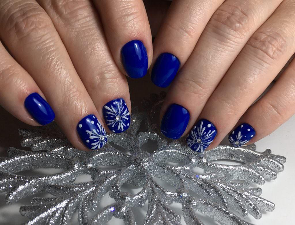Зимой синий маникюр выглядит особо актуально. Можно также создавать новогодний дизайн, нанося на ногти изображение снежинок, снеговиков, елочек и тд. Зимой можно более свободно добавлять в декор красный и бордовый лаки. Это будет смотреться очень гармонично.