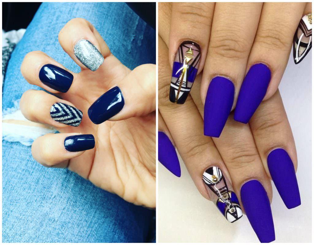 В этом году синий оттенок сам по себе модный и трендовый. Главное придумать интересный дизайн и оформление ногтей. Подчеркнуть глубину синего маникюра можно использовав гель-лак кошачий глаз в комплексе с полупрозрачным витражным покрытием. Для вечернего модного маникюра не грех использовать россыпь страз Swarovski, ведь сейчас как никогда актуальна инкрустация ногтей.