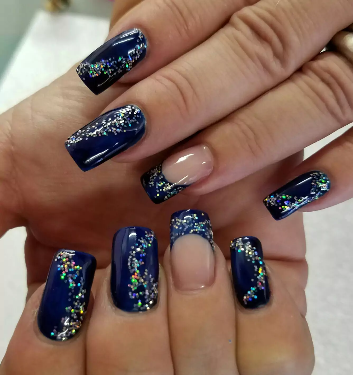 Необычный маникюр, сочетающий в себе оформление синим цветом и блестящий градиент, идеально подходит для праздничного образа. Синий лак здесь используется в качестве основы. А переливающиеся блестки создают эффект «млечного пути».