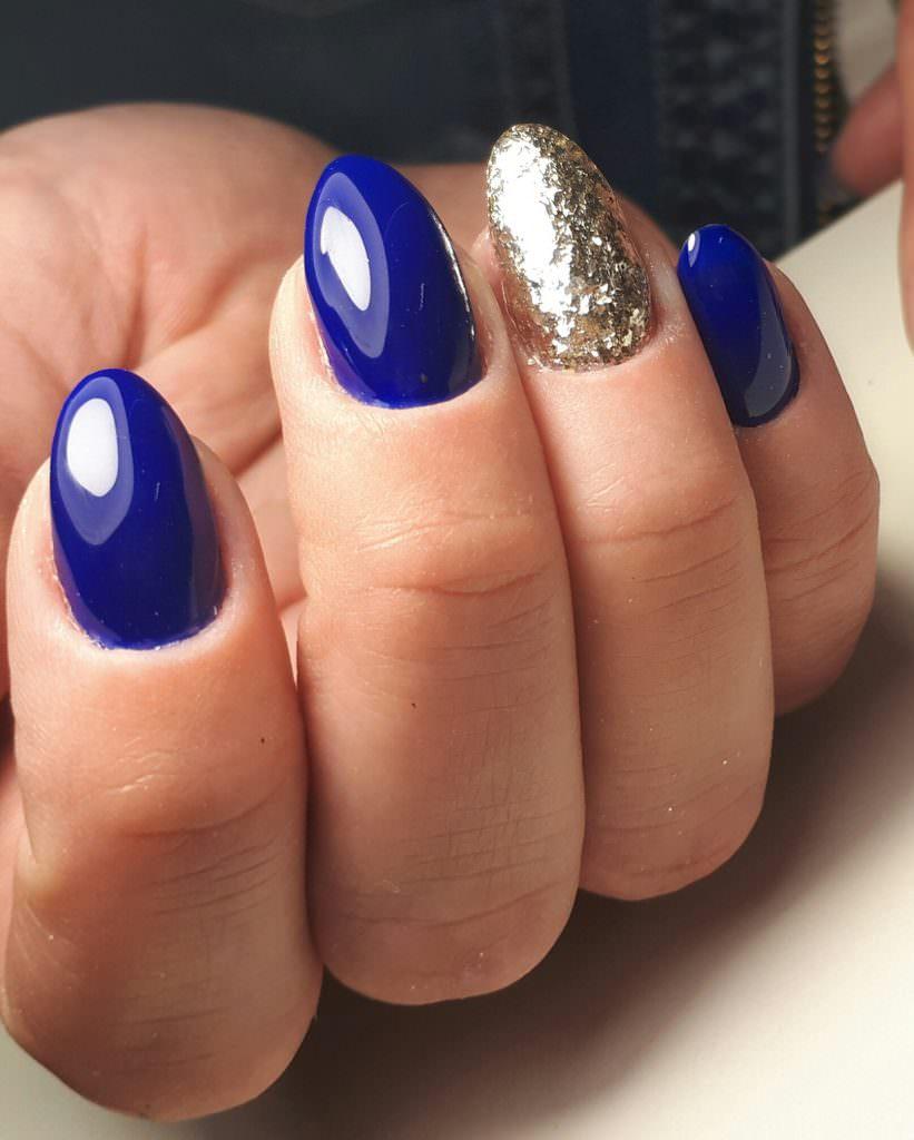 - Золотые украшения – золото и синий цвет великолепно сочетаются друг с другом, создавая пышные и элегантные образы. Золотые серьги, цепочки или кольца станут прекрасным дополнением к синему маникюру.