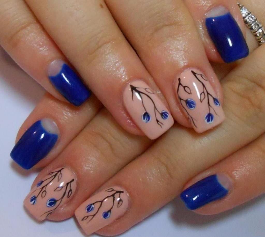 - Весной рекомендуется бежевый маникюр с красивыми синими цветами.