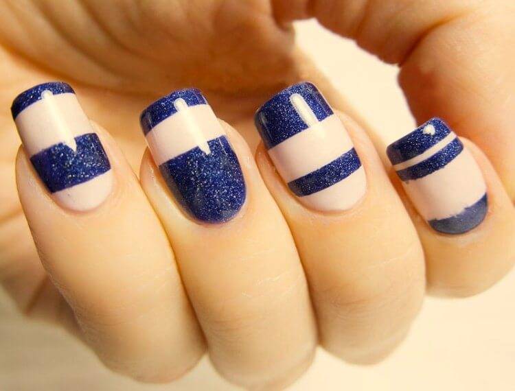 В этом случае применяются не очень пестрые цвета, а синий заменяется на воду. Профессионалы рекомендуют наносить узор в горошек стандартного черного или белого оттенка. Необычно смотрятся и плавные переходы от темно-синего к синему.
