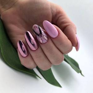 Фольгированные тонкие листики металлов разных цветов — отличный способ декорировать ногти. С помощью фольги можно полностью закрасить пластину, словно на нее нанесли металл схожего или контрастного цвета. Кроме того, кусочки фольги можно кисточкой нанести на ноготки и закрепить лаком.