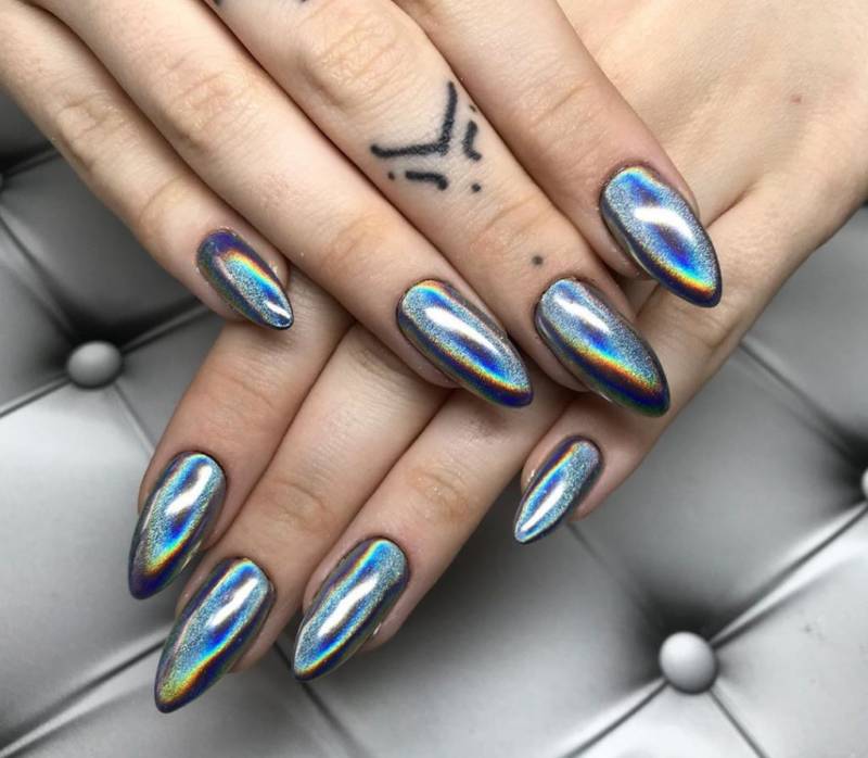 Красочные переливы подарит голографическая втирка, а металлический блеск – зеркальная втирка. Интересным окажется яркий маникюр с втиркой для ногтей «жук», что создает изумрудно-золотые переливы на ногтях.