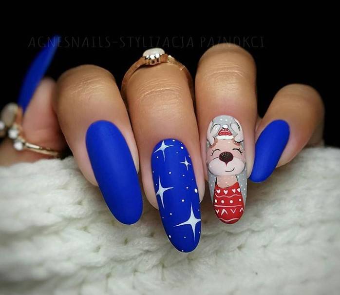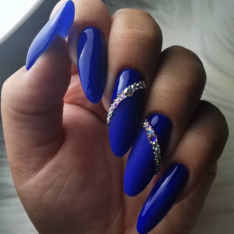 Миндалевидная форма удобна и более популярна. Особенно хорошо подойдет под однотонный синий маникюр. Матовый миндаль стоит украсить стразами около лунки, либо выбрать вариант декорирования одного ногтя. Беспроигрышный вариант: блестки, либо рисунки флоры или фауны.