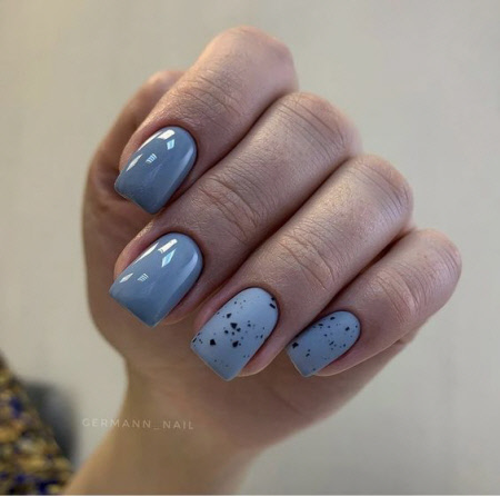 Бирюзовые оттенки гель-лака смотрятся намного интереснее с топом, имитирующим принт в стиле «перепелиное яйцо» — тренд. Черные или белые хлопья на матовом бирюзовом однотонном покрытии — самый быстрый и модный способ оформления ногтей в этом году. Этот декоративный топ или гель прекрасно дополнит дизайн «разные руки», геометрический принт, молочный градиент, маникюр с использованием росписи, слайдера, стемпинга, акварели. Выбор нейл-идей и стилей — широк.