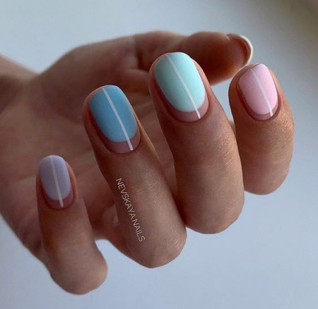 Французский маникюр — бессменный лидер любого сезона. Классический вариант дизайна ногтей уже давно не имеет никаких рамок. Очень эффектно смотрится вариант треугольного френча с разноцветными полосками на краю пластины — это могут быть два оттенка голубого, контрастные цвета. Дизайн френча ограничен исключительно вашей фантазией.