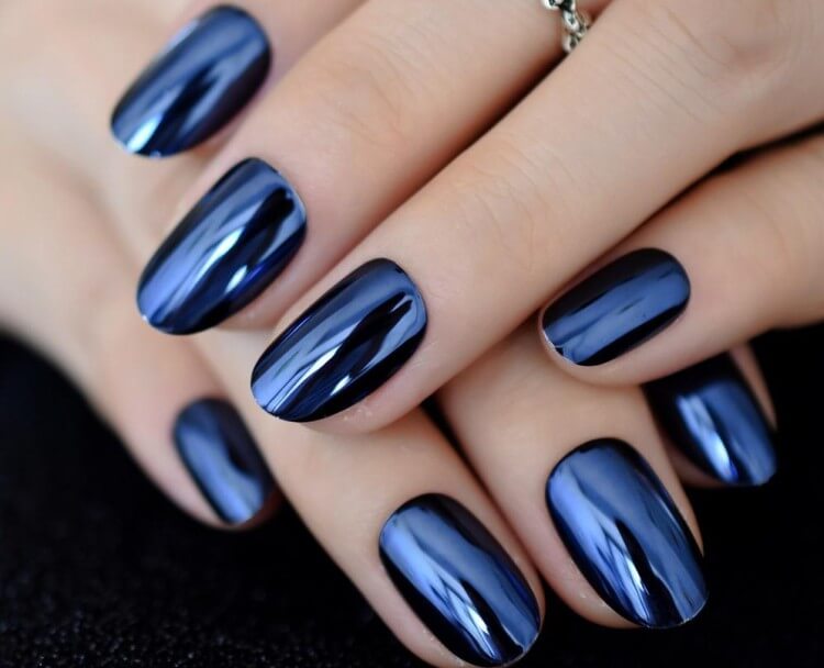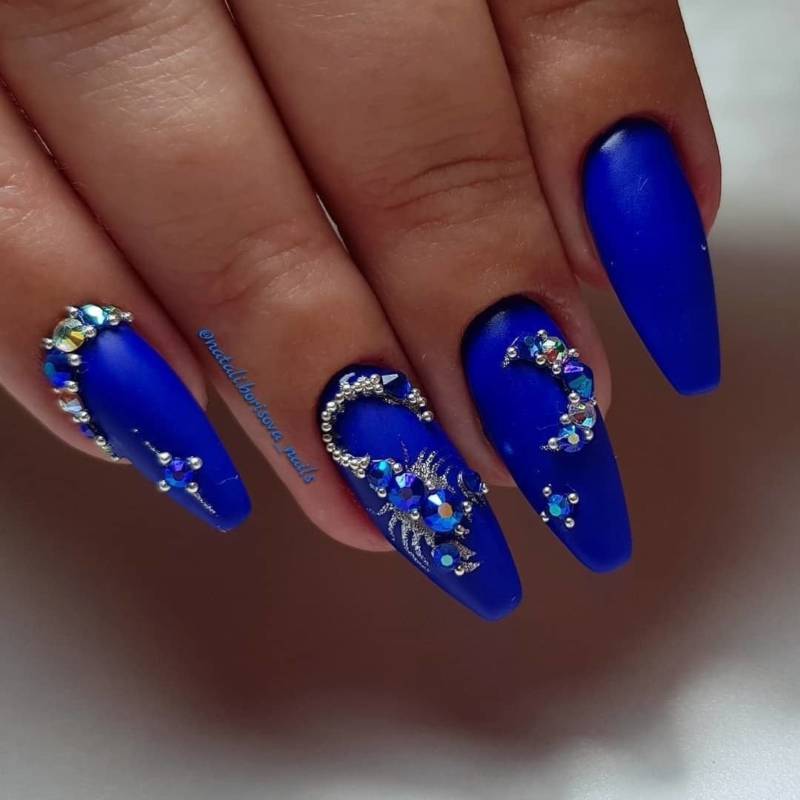 На длинные острые ногти лучше всего подойдет глянцевый лак или матовые бархатистые синие оттенки. Их тоже можно использовать на квадратных ногтях, но они не будут смотреться так органично, и к ним желательно добавить орнаментальные узоры, позолоту и стразы. Это сделает нестандартную форму еще более креативной.