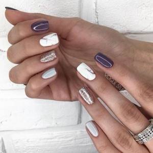 Сияющие стразы на ноготках – украшение любого маникюра. Камушки могут быть разных цветов и размера. Мастера нейл-арта рекомендуют разбавлять белый и синий оттенки посредством золотистых и серебристых стразов.