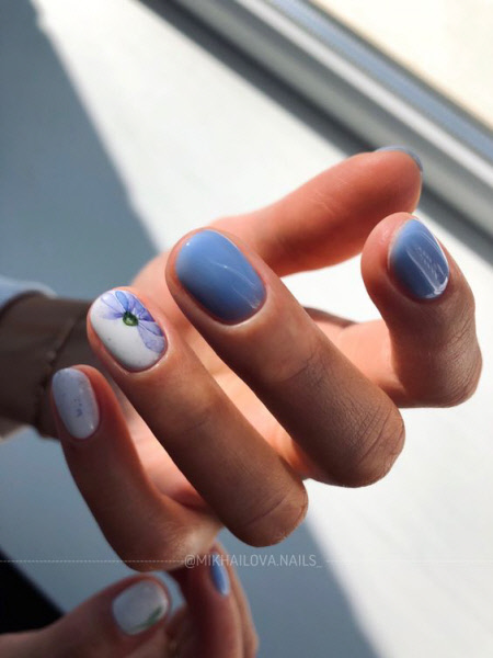 В весеннем маникюре идеально будут смотреться цветочные принты, контрастные веточки и нежная зелень. Все эти мотивы идеально смотрятся на голубом фоне и подходят для повседневного нежного маникюра на весну.