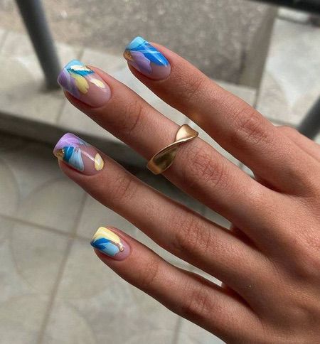 Камуфлирующие витражные цвета модно носить как самостоятельное покрытие, можно использовать в дизайнах стемпинг, слайдеры, акварель. Преимущество лучше отдавать морским, цветочным и растительным узорам.