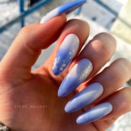 Острая форма синих ногтей весьма популярна, поскольку на ней выгодно смотрятся любые дизайны. Особо ярко будет выглядеть градиентный маникюр. Подойдет либо классический, в сочетании с белым, либо плавное перетекание оттенков, имитирующее звездное небо.