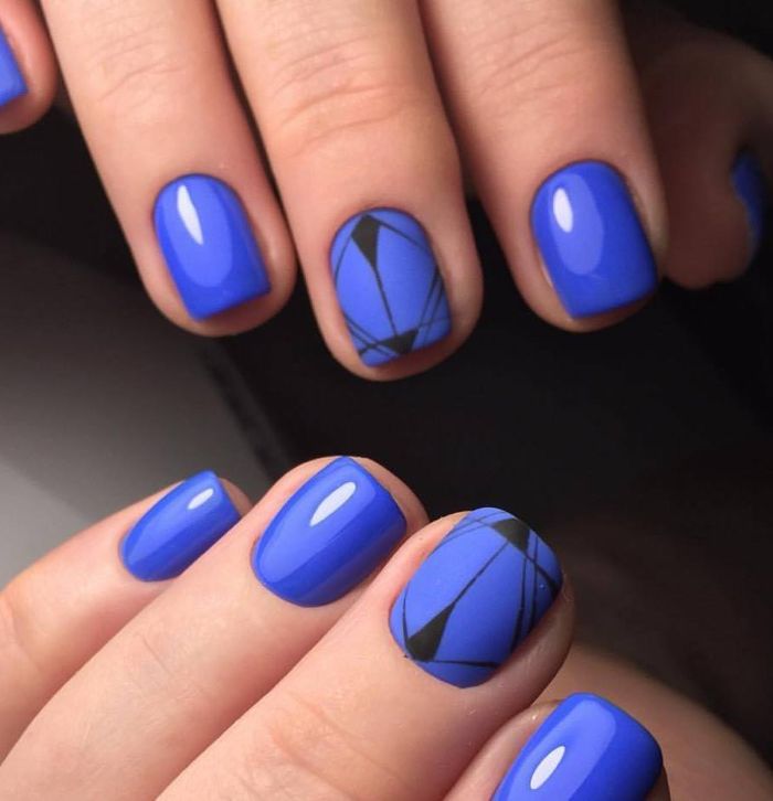 Для квадратной формы чаще всего выбирают синее глянцевое покрытие. Дизайн будет любой: от простой фольги до технически сложных рисунков. Единственное опущение — такие ногти нуждаются в тщательном выборе оттенка, чтобы маникюр выглядел изысканным.