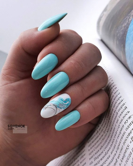 Оттенки могут быть разные, но главное преимущество однотонного покрытия — выглядит аккуратно, ярко и стильно, не перегружен деталями. Причем этот цвет подойдет к длинным и коротким ногтям, напоминает морскую воду и самоцвет под названием «Бирюза». Холодный, но благородный бирюзовый цвет лака сочетает в себе нежно-голубой, белый и светло-зеленый оттенки.