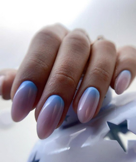 Особенно нежно смотрятся такие переходы с использованием голубой палитры. Выбирайте с какого тона начать градиент — с более светлого или, наоборот, темного. А может быть начать стоит вообще с молочного или прозрачного лака.