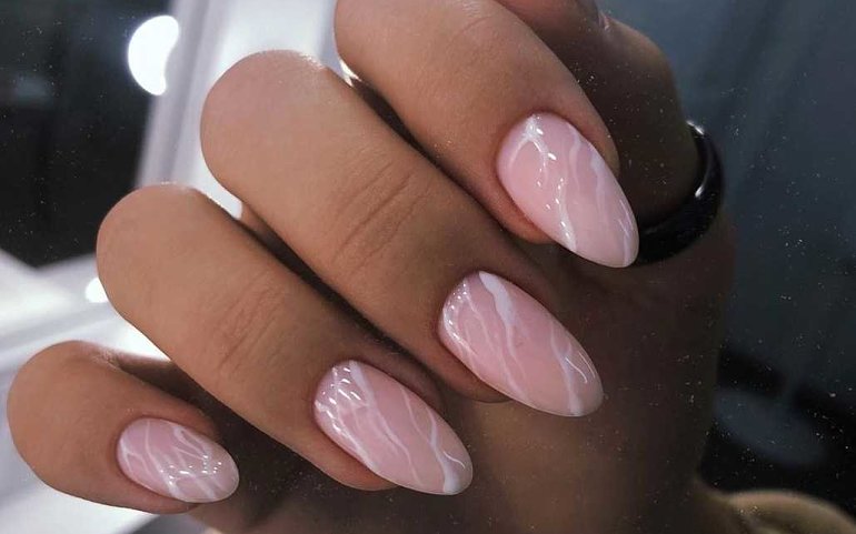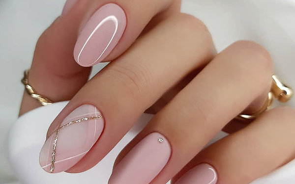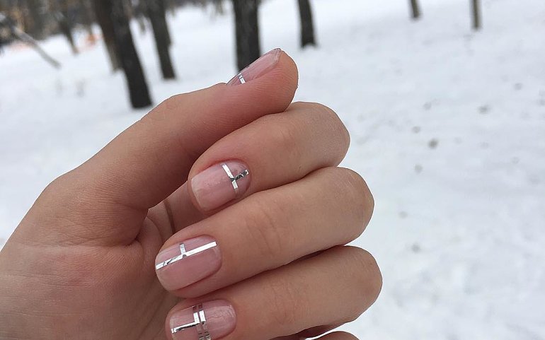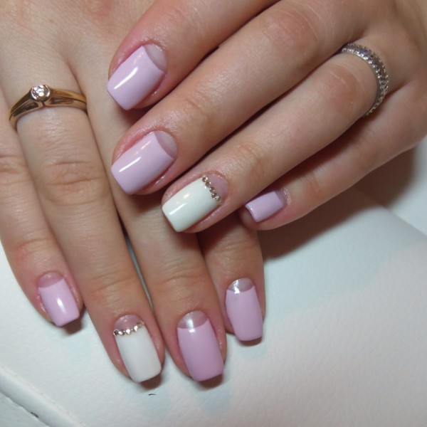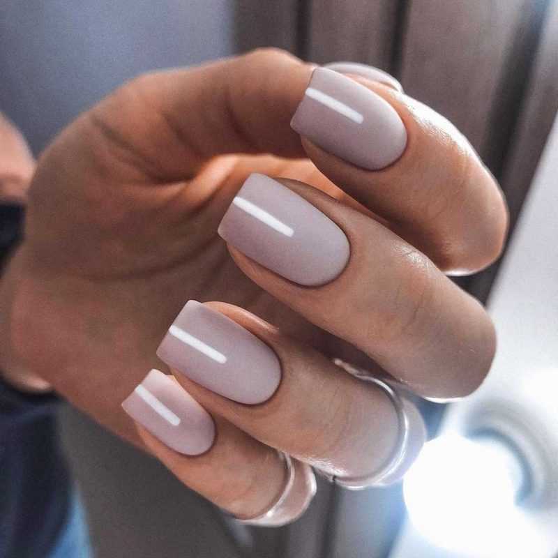 Нежный бежевый, розовый, белый, используемые во французском маникюре, подойдут и для других модных трендов. Полупрозрачный нежный оттенок можно украсить полосками, графическим рисунком.