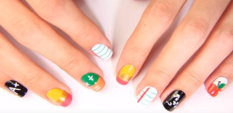 По тому же принципу можно сделать и другие варианты школьного маникюра, например такой.
