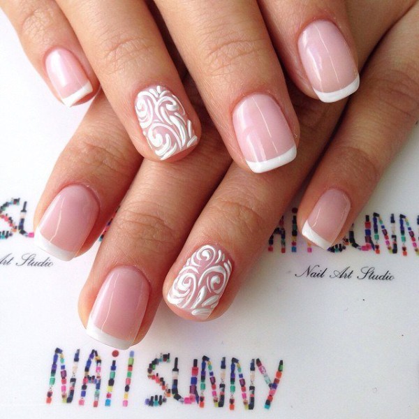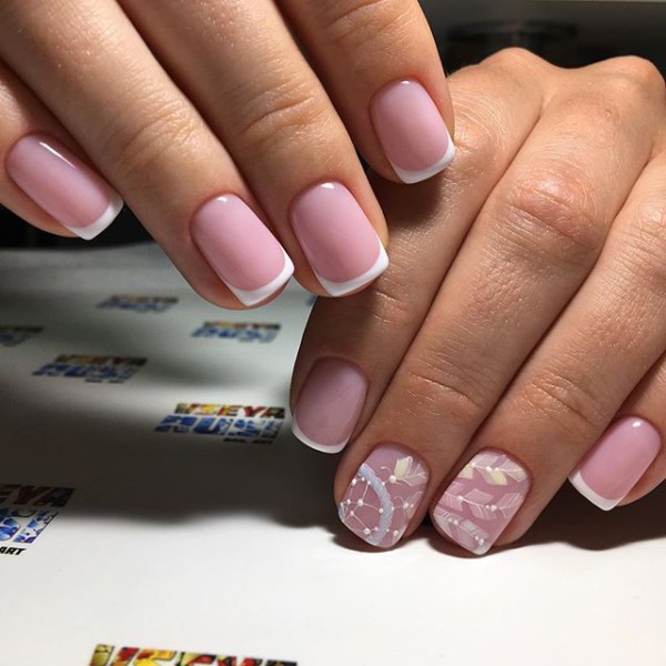 - Классика жанра — классический френч. Основа такого маникюра как правило или бежевая или нежно — розовая, края ногтевой пластины аккуратно подчеркнуты белым цветом.