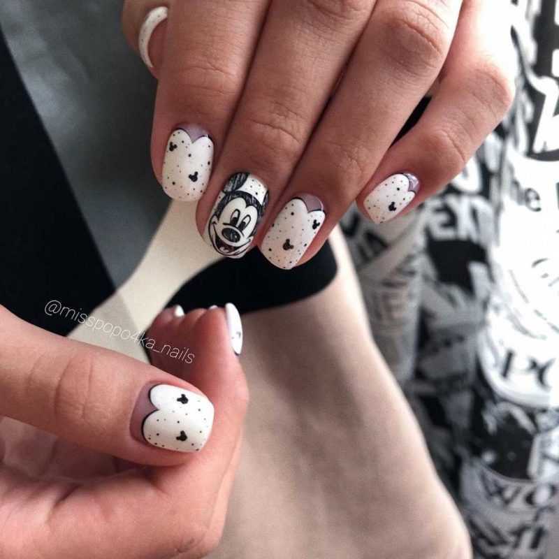 - Светлый маникюр с рисунком. Это могут быть геометрические фигуры, цветы, растительные изображения. И мультяшные герои все так же актуальны. Пример школьного дизайна:
