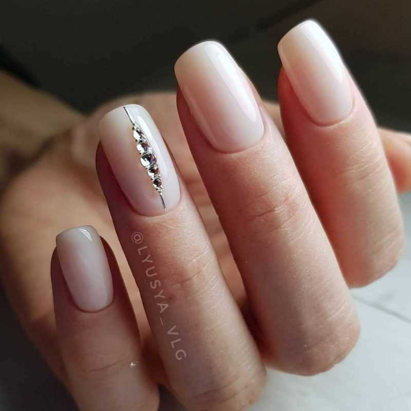 Разместите стразы около кутикулы или блестящие акценты, к примеру лунки и линии. Также замечательно выглядит растяжка из блесток, плавно сходящая на нет.