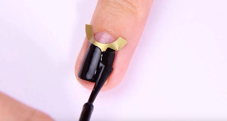 10. На безымянном пальце нарисуем школьную форму. Приклейте трафарет для французского маникюра, как показано на картинке. Покрасьте ниже трафарета черным лаком. Не дожидаясь высыхания, снимите трафарет.