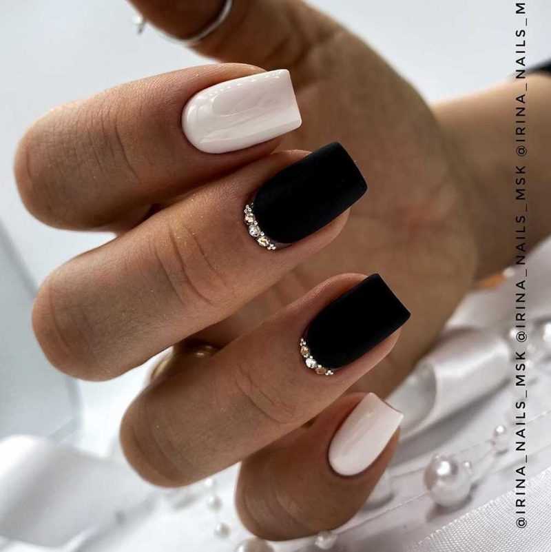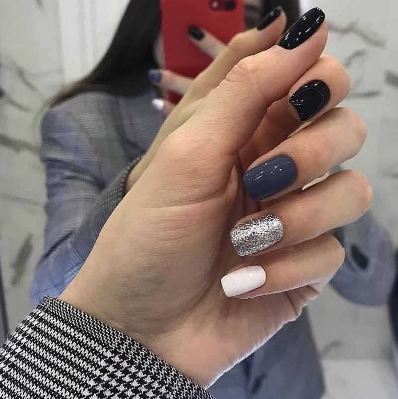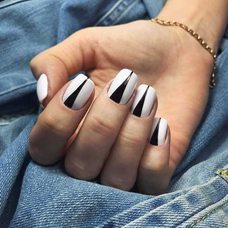 Для белого верха и черного низа одежды подходит маникюр, украшенный неброским рисунком, комбинирование трех и более цветов, гармонирующих друг с другом. Новый тренд колор-блокинг основывается не на выделение определенного цвета, а на дополнении одно оттенка другим.
