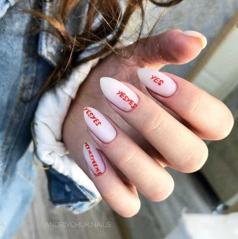 Среди молодых особ в последний год популярны наклейки с фразами и словосочетаниями. Их можно разместить на нежном фоне, а соседние ноготки выделить черным или белым цветом. Как самостоятельно использовать слайдеры мы пошагово расскажем в конце статьи.