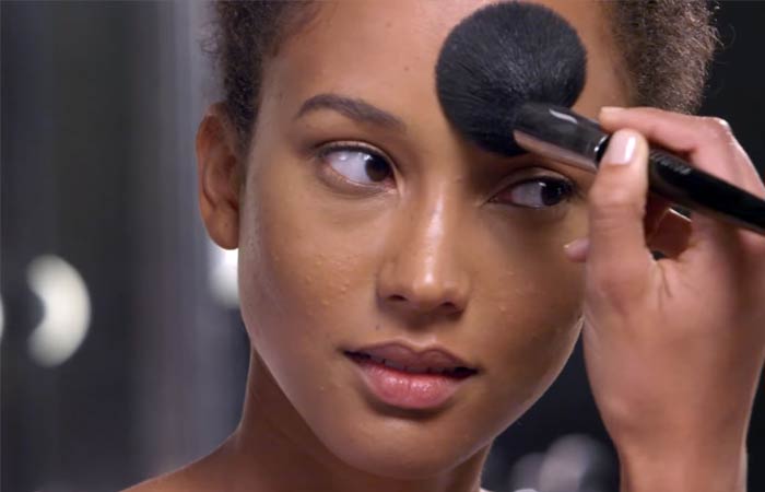 На виски и скулы наносят бронзатор. Затем косметику хорошо растушевывают, чтобы не оставалось четких линий.