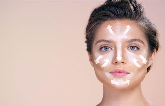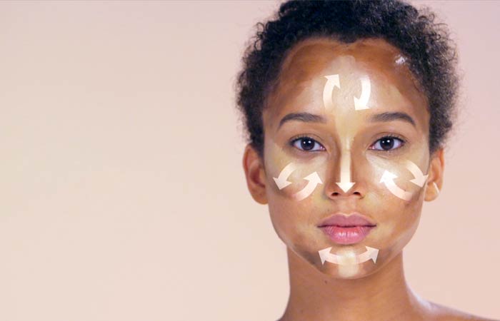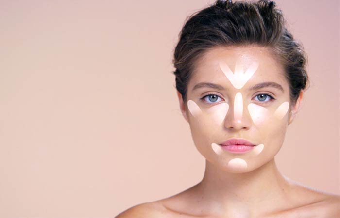 Подготовьте вашу кожу с увлажняющим кремом и основой. Выделите вверх в виде дуги или полукруга на лбу и проведите им прямо вниз по носу. Также выделите подбородок, внешние углы рта, область под глазами и скулы.