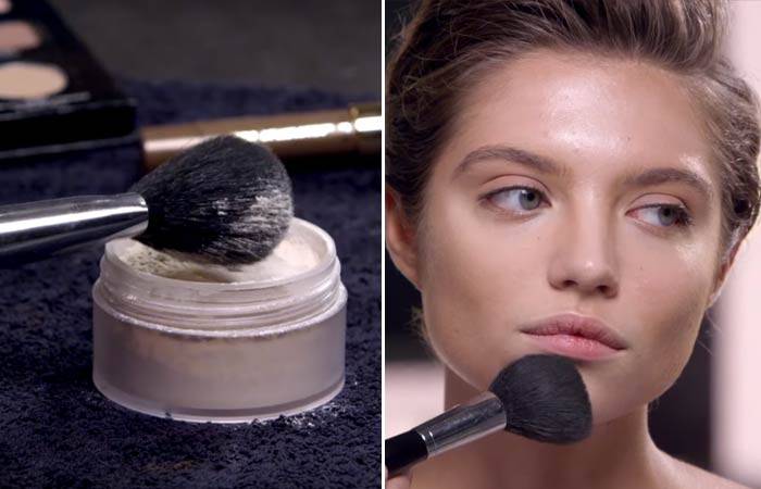 Используйте прозрачный порошок, чтобы установить продукт. Начиная с центра вашего лица, используйте щетку и слегка нажмите и сверните пудру на области, не нарушая макияж под ней.
