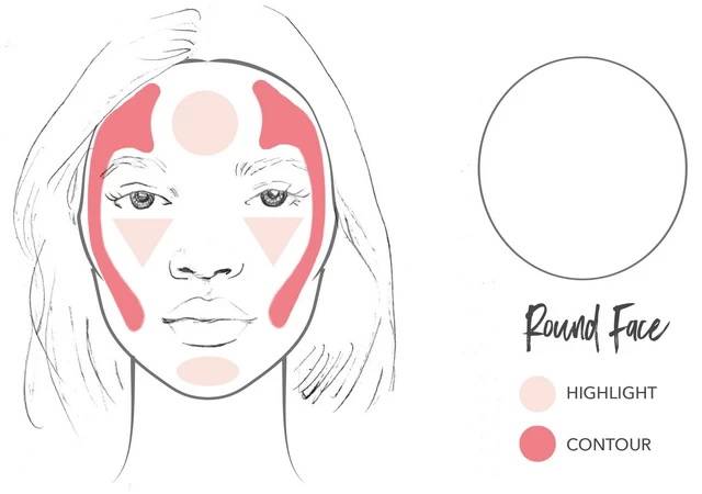 Коррекция округлых форм предполагает углубленное затемнение по бокам лба, висков и большей части щек, включая угол нижней челюсти. Хайлайтер наносится под глаза, на центральную часть подбородка и лоб (середину).