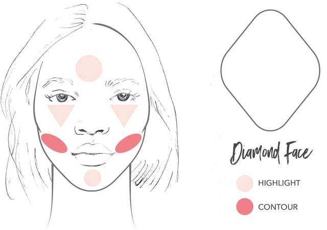 Для улучшения черт лица в форме ромба хайлайтер распределяется по центру лба и подбородка, также оформляются блики под глазами. Затемнение делается исключительно сбоку от скуловых костей.