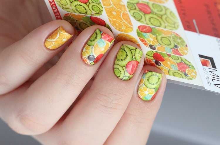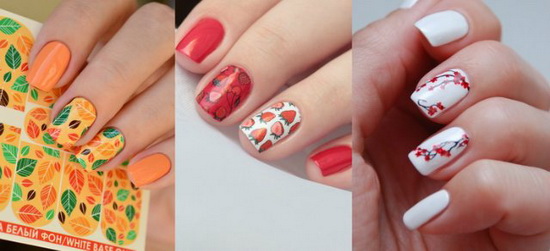 Разноцветные листья, веточки цветущих деревьев или целые пейзажи. Такие узоры нравятся девушкам романтичным, которые умеют ценить прекрасное. Барышни, обладающие веселым нравом, любят помещать на ноготки изображение сочных фруктов или ягод. Это отличный вариант летнего маникюра. А если наклеить арбузы или клубнику на ногти в зимний период, то можно вернуть ностальгические воспоминания о лете.