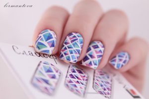В новом сезоне в моде маникюр с рисунком, имитирующим витражную мозаику. Воспроизвести подобный декор обычными гель-лаками крайне затруднительно, да и выглядеть будет излишне объемно. В подобной технике именно маникюр со слайдер-дизайном смотрится предпочтительнее. Примеры на фото.