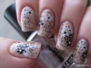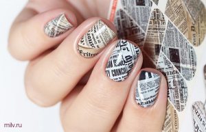 Новую популярность в нынешнем сезоне переживает газетный маникюр. Если раньше его делали обычным переводным способом с газетных страниц, то теперь он стал более аккуратным и эффектным, благодаря слайдерам. Ногти «обернутые» в газетные листы смотрятся лаконично и стильно, а главное – они также универсальны, как и френч.