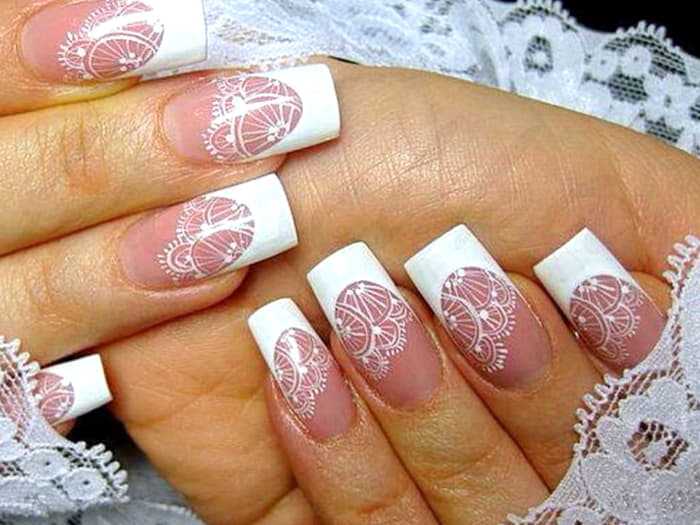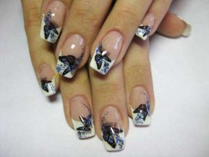 Стильно выглядят кружевные декоры по френчу, нежные цветы по краю ногтя, мягкие переходы от элемента к элементу. Добавьте еще и парочку стразов или россыпь блесток, и вы получите роскошный и стильный маникюр.