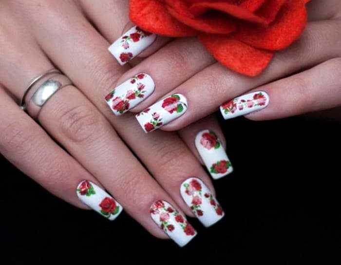 Красиво смотрится под гель лаком пленка с фотопринтом, позволяя сделать шикарный и завораживающий маникюр. Воду при этом не используют. Фотопленки можно приобрести либо уже готовой формы, либо сплошным листом, из которого вырезают рисунок по ногтю.