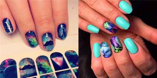 Фотонаклейки позволяют нанести на ногти самые невероятные и очень реалистичные изображения. Отлично подойдут тем, кто не умеет рисовать сам, так как имеют законченный дизайн. Все одинаковые картинки могут дублироваться на каждом пальце, а могут иметь близкую тематику.