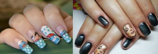 Желающие временно впасть в детство могут изобразить на ногтях любимых с детства Винни-Пуха с Пятачком или миленьких Смурфиков. Для маникюра в стиле гранж или арт-хаус подойдут фотографии знаменитостей, например, участников группы Биттлз или прекрасной Мэрилин Монро.