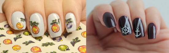 Слайдер-дизайн на ногтях отлично подойдет для тематической вечеринки или какого-нибудь праздника. Например, на новый год можно украсить ноготки изображениями Деда Мороза, снеговика, елочек, подарков или мандаринов. Тем, кто увлекается конным спортом, можно выбрать слайдеры с лошадками. Жена или подруга моряка может порадовать любимого маникюром с якорями, тельняшкой или целым кораблем.