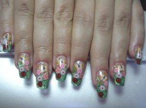 - Нарощенные ногти подвергаются дизайну перед тем, как нанести финишный слой. Окончив моделирование, наносят переводные наклейки или термопленку, дополняют дополнительными элементами (к примеру, стразик или бульонки).