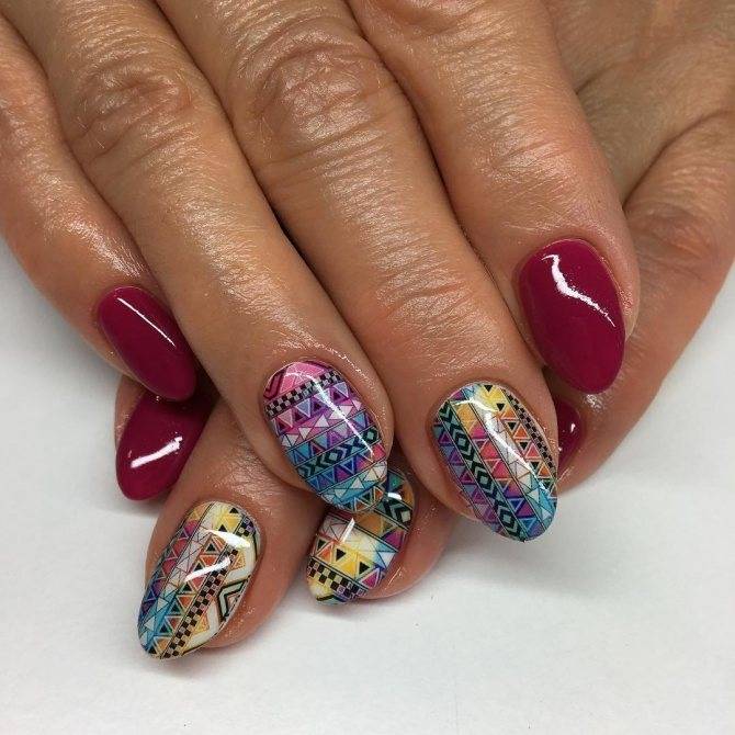 Он более легкий для самостоятельного создания и естественен. Красиво выглядят яркие принты: красный, оранжевый, голубой. Для этого подбирается металлик, френч. Небольшие наклейки в виде фигур и зверей, с полосками. Такого рода элементы не нагружают ноготок.