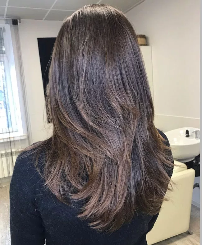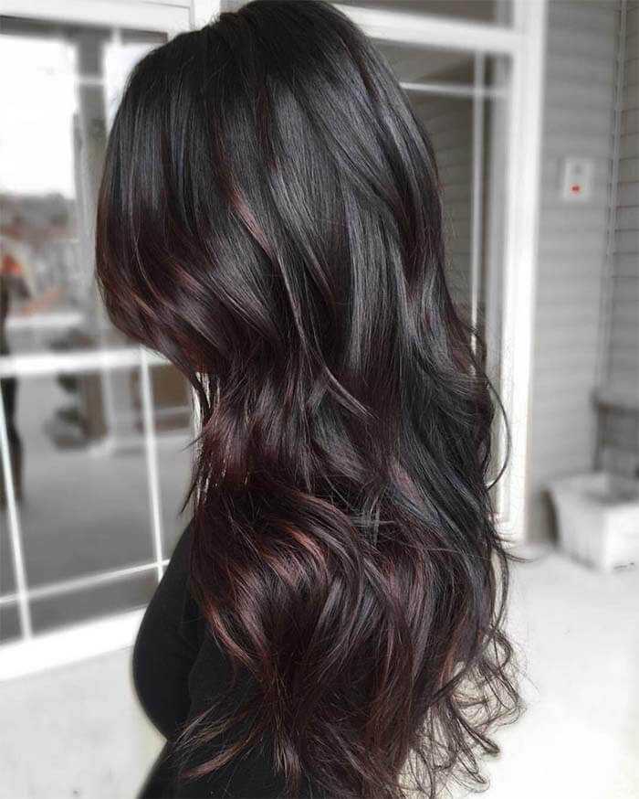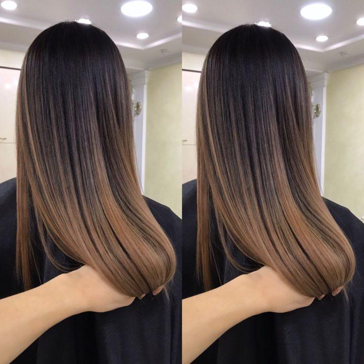На темно русые и черные волосы горизонтальная растяжка подойдет больше всего — это создает дополнительный рельеф и объем. При этом каждая брюнетка сможет без проблем выбрать 3-5 тонов для окраски, чтобы переливы и отблески выглядели натурально. Красивым вариантом мастера считают сочетание холодных и теплых тонов — это создает блеск и живость.