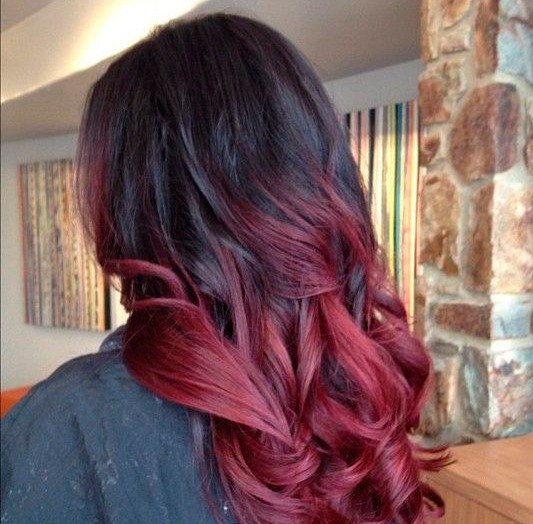 - Брюнетки могут украсить концы своих волос бронзовым тоном или оттенком коньяка, а красавицы со жгуче-черными волосами нередко выполняют эпатажный красный балаяж.