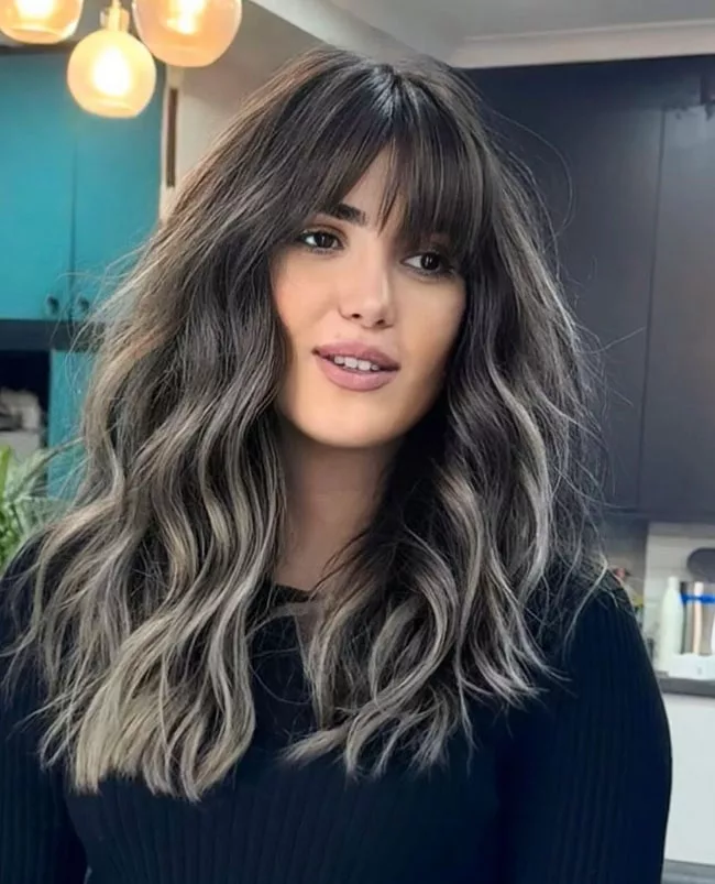 Хорошо смотрится балаяж на темные волосы с челкой светлого цвета. Для достижения естественного выгорания на солнце, делается плавный переход от натурального тона к блонду.