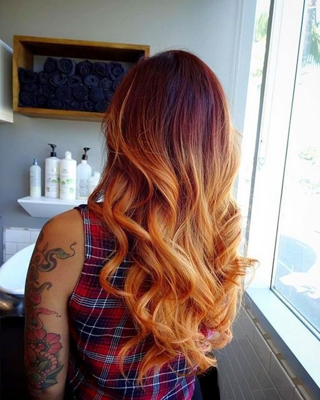 Особенно красиво колорирование смотрится на рыжих и медных волосах. С ними комбинируется много тонов: от жженой карамели до золотистого блонда. Помимо того, что на солнце сверкает базовый оттенок, блестят еще и сами пряди. В местах перехода образуются интересные цвета: мокко, кофе, охра, каштан, шоколад.