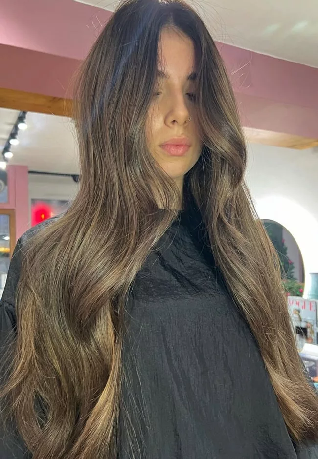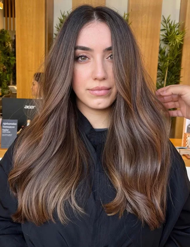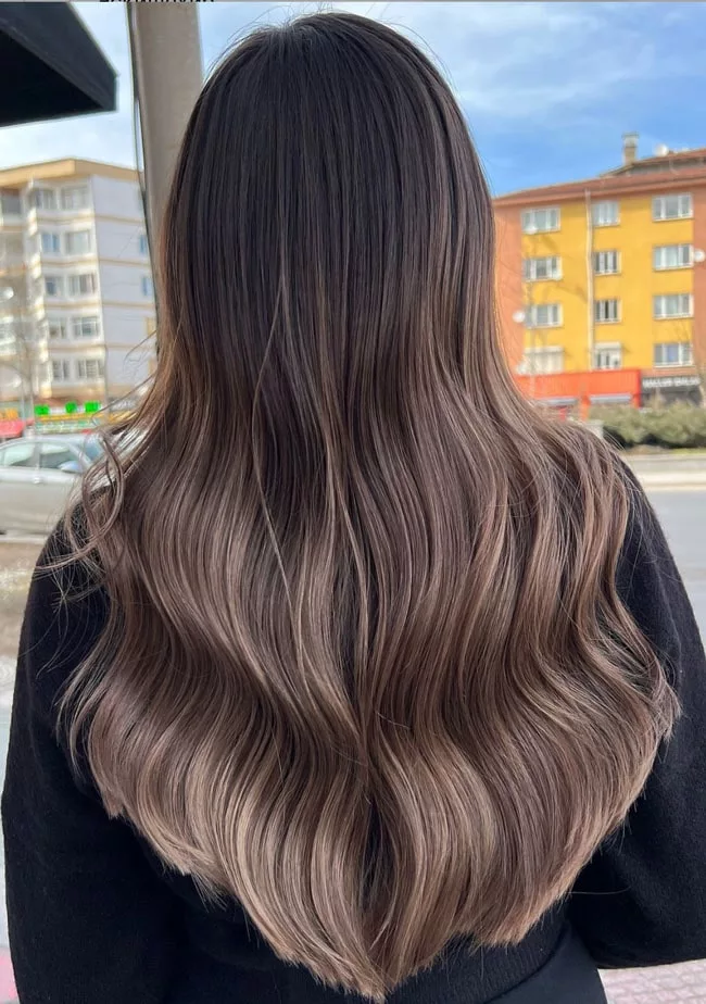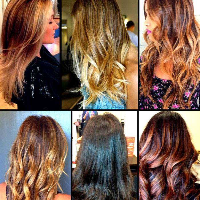 От коричневого до светло-коричневого цвета или даже до самой яркой светлой блондинки на концах, такими могут быть переходы на темных волосах: шоколад, орех, карамель, кофе с молоком.