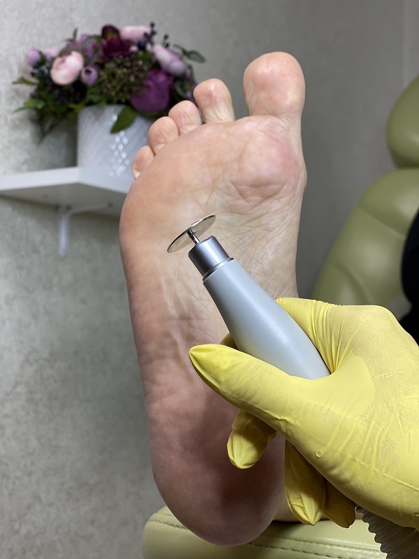 - Следующий этап – обработка стопы. Специалист подбирает насадку в зависимости от актуального состояния кожи, толщины, наличия мозолей, трещин.