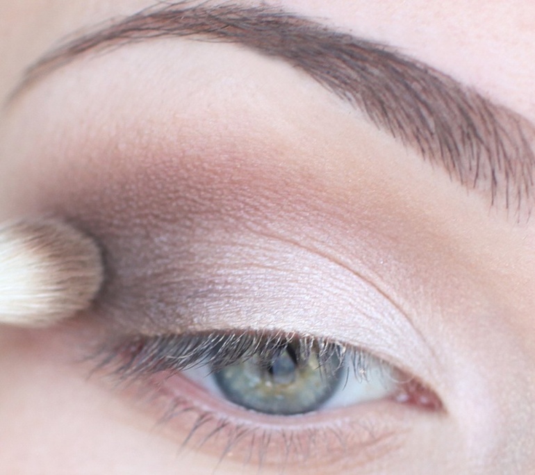 - На все веко нанести самые светлые оттенки из выбранных. Например, бежевые или белые.